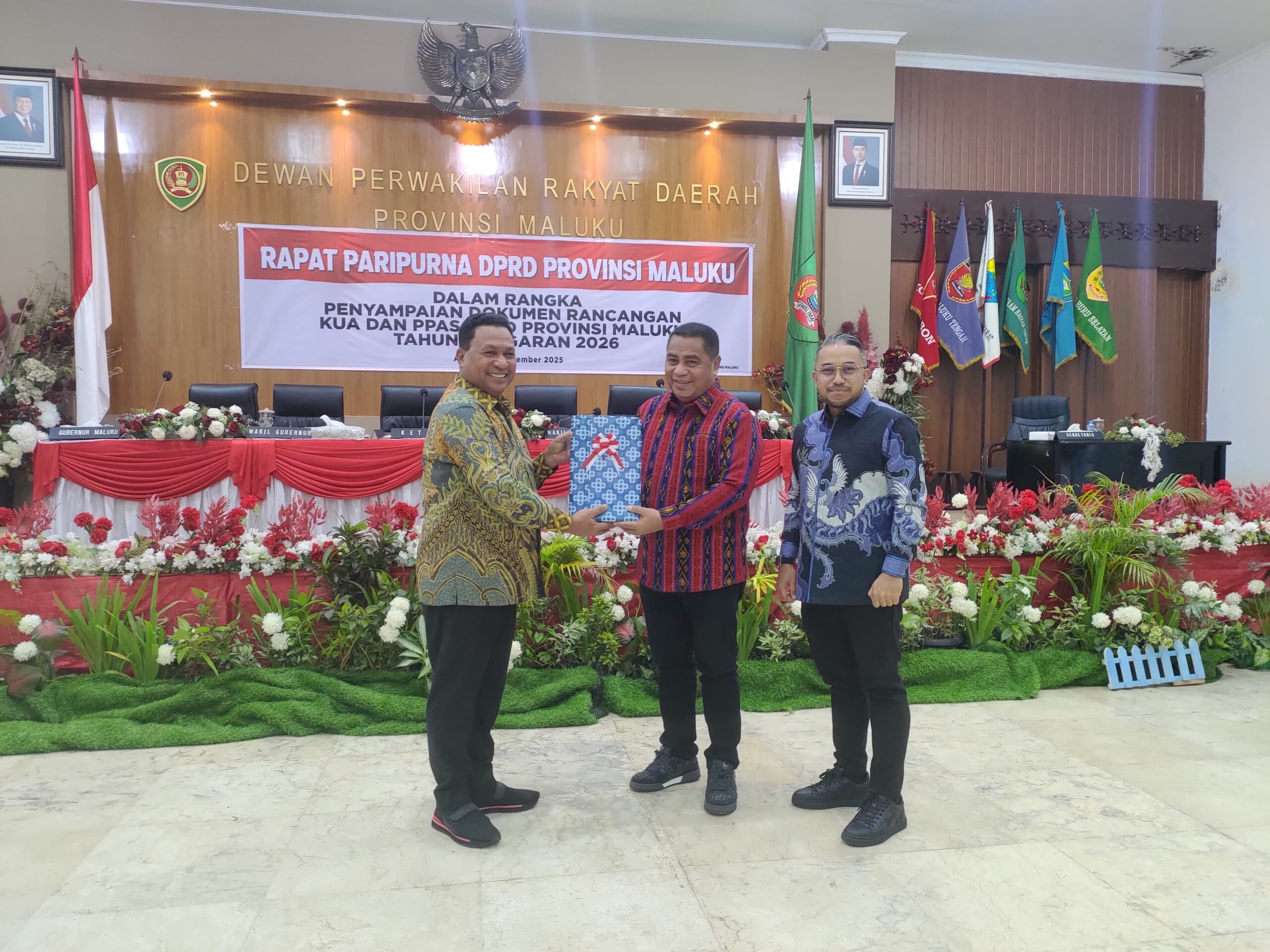 Rapat Paripurna DPRD Provinsi Maluku dalam rangka penyampaian Rancangan Kebijakan Umum Anggaran serta Prioritas dan Plafon Anggaran Sementara (KUA-PPAS) Tahun Anggaran 2026 dihadiri oleh Ketua DPRD Maluku, Benhur G. Watubun, Wakil Ketua, Fauzan Rahawarin serta seluruh Anggota DPRD Provinsi Maluku, Forum Koordinasi Pimpinan Daerah (Forkopimda) Provinsi Maluku atau yang mewakili, para Staf Ahli dan Asisten Sekretaris Daerah (Sekda) beserta pimpinan Organisasi Perangkat Daerah (OPD) di lingkungan Pemerintah Provinsi Maluku, serta rekan-rekan media cetak dan elektronik. (BM01)